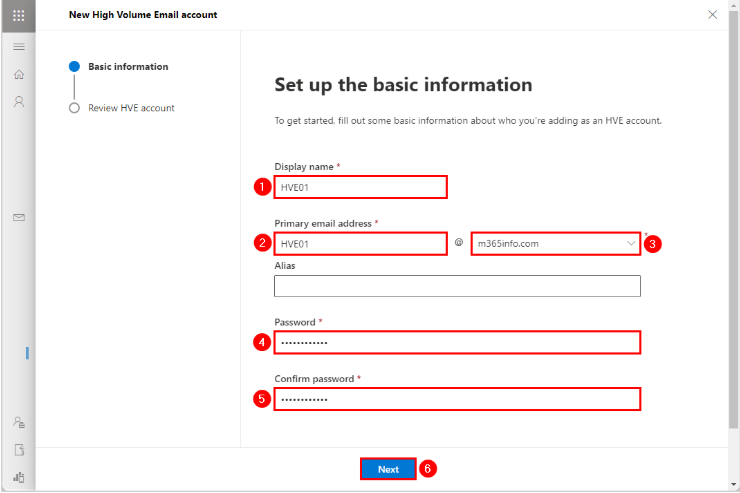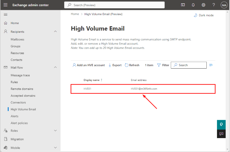 Microsoft 365'te Yüksek Hacimli E-posta, esas olarak Exchange Online ile dahili ve sınırlı sayıda harici e-posta göndermek isteyen kuruluşlar içindir. Kurmak için, toplu e-posta göndermeye başlamadan önce bir HVE hesabı oluşturmanız gerekir.
