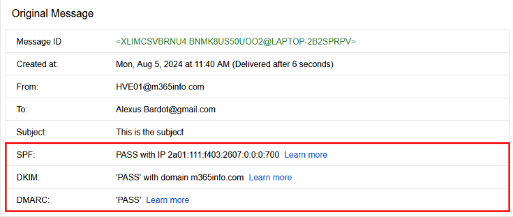 - E-postanın orijinal mesajını gördüğünüzde, SPF, DKIM ve DMARC'ın PASS olduğu gösteriliyor.